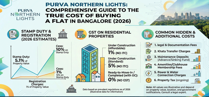 Welcome to the real cost of buying a flat in Bangalore in 2026 — where the "price" you're quoted is frequently just the beginning of a significantly larger outlay. For buyers looking at upcoming landmark projects like Purva Northern Lights in North Bangalore's KIADB Aerospace Park, or any other premium development, understanding every cost component before signing isn't just smart — it's essential to avoid financial shock at the registration table.